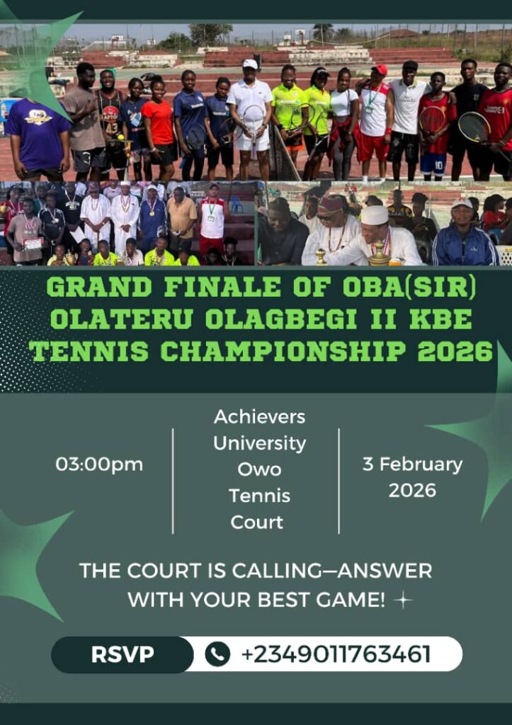 Achievers University, Owo, on Tuesday hosted the second edition of the Ọba (Sir) Olateru Olagbegi II KBE Tennis Championship, transforming its tennis court into a rallying point for sport, scholarship and character-building as students were urged to “keep their eyes on the ball”—on court, in classrooms and in life.